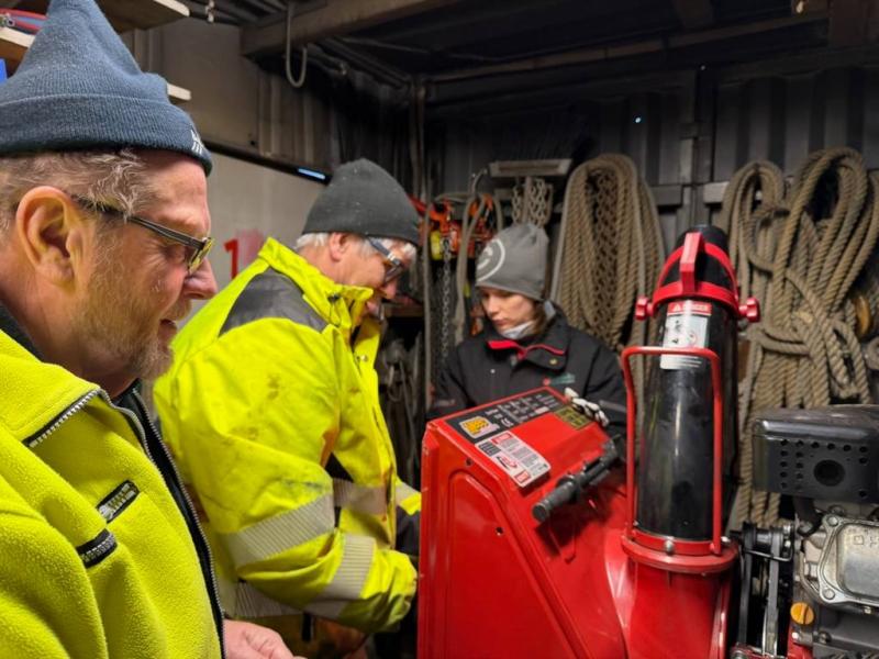 Sara L, Leif N o Peter S tinar upp värmepumpen som var full av is.